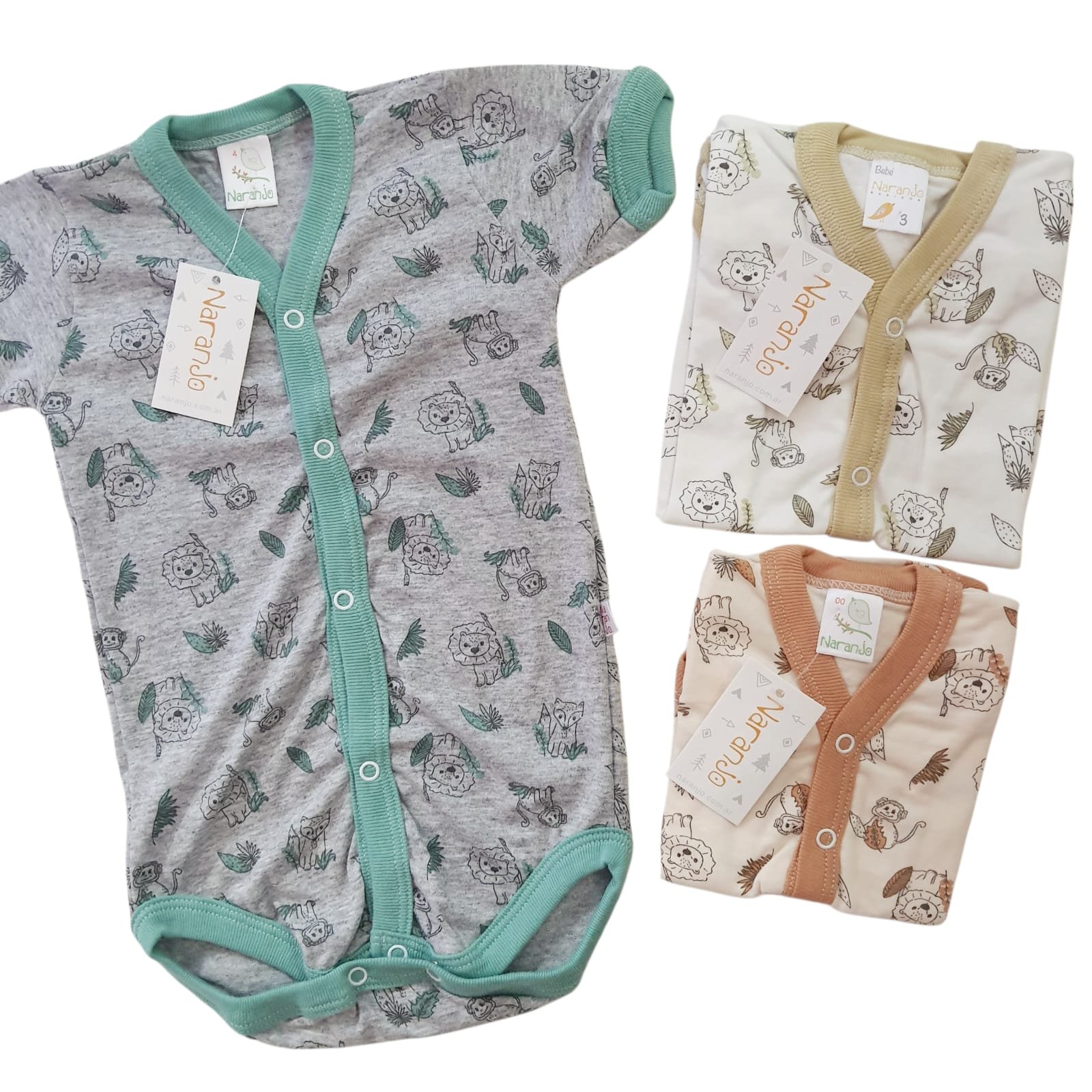 Body mangas cortas, estampado con animalitos de la selva, con botones adelante. 100% Algodón, ideales para todo el año.
